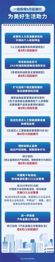 一批民生新规8月开始施行。从完善人力资源服务机构管理,到强化养老机构消防安全;从扩大适用个税优惠政策的商业健康保险范围,到规范生成式人工智能服务……法治,为美好生活助力。