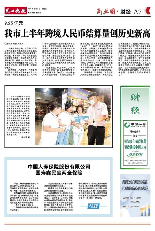 本报讯 今年以来,人行周口市中心支行采取多种措施积极引导金融机构精准对接,疏通人民币结算渠道,大力推广本币结算,持续提高金融服务实体经济质效,推动跨境人民币业务增量扩面。截至2023年6月末,我市跨境人民币结算量达9.25亿元,同比增长578.4%,创历史新高,增幅居全省第二。
