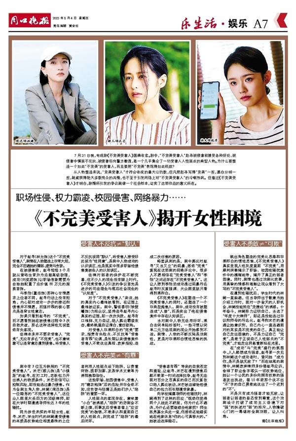 7月31日晚,电视剧《不完美受害人》圆满收官。剧中,“不完美受害人”赵寻被侵害前接受各种好处、被侵害中懦弱不反抗、被侵害后向警方撒谎,是一个几乎集合了一切受害人人性弱点的典型人物。为什么要塑造一个如此“不完美”的受害人,而且要把“不完美”表现得如此极致?