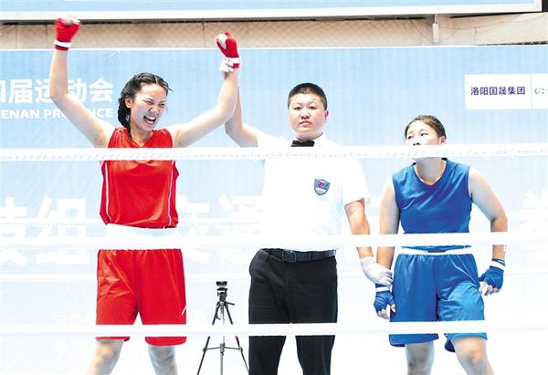 8月5日,第十四届河南省运动会青少年竞技组女子甲组69公斤级拳击赛中,周口姑娘张梦鸽以5:0击败东道主洛阳队的聂玉盈获得金牌。据了解,根据赛事赛程安排,第十四届河南省运动会共有35项赛事,其中先期比赛项目于6月中下旬开赛, 截至8月6日下午,已经结束17项比赛;周口共参赛24个项目,已经打完14项比赛,共收获17枚金牌、23枚银牌、22枚铜牌。②15记者 梁照曾 摄