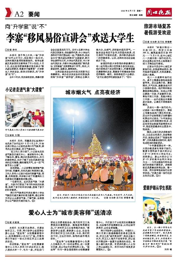 “今年暑假跟往年一样,大部分都是家长带孩子旅行,像夏令营和亲子游大部分以6岁~15岁的中小学生为主;夜爬泰山、黄山大部分以16岁~25岁的高中生和大学生为主……今年出国旅行和长途旅行的顾客不算很多,多数顾客还是愿意选择周边游,像一日游、两日游等短途旅行比较受欢迎。”交通大道一旅行社店主告诉记者。②15