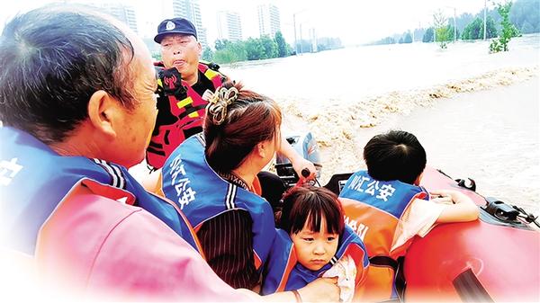这是2023年8月2日,周口市公安局川汇区分局义警抢险救援队在河北涿州洪灾现场开展救援的一幕。