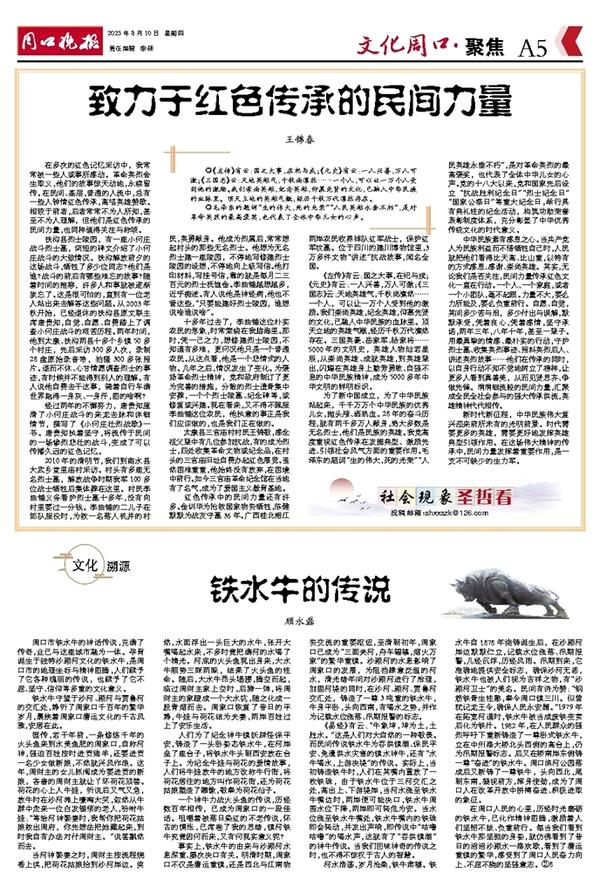 在周口人民的心里,历经时光磨砺的铁水牛,已化作精神图腾,激励着人们坚韧不拔、负重前行。每当我们看到铁水牛那坚挺的身姿,就仿佛看到了昔日的滔滔沙颍水一路欢歌,看到了漕运重镇的繁华,感受到了周口人民奋力向上、不屈不挠的坚强意志。②8
