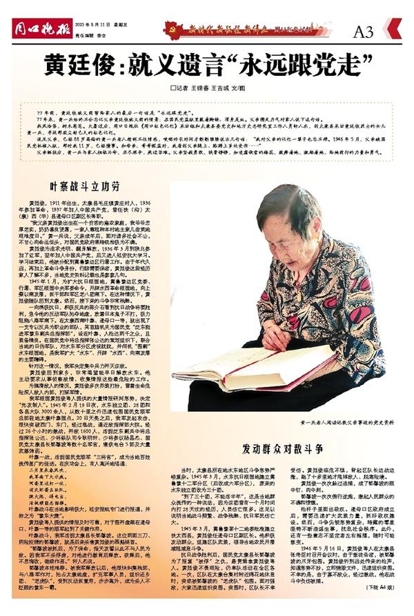 父亲最后的嘱咐,黄一兵始终没有忘记,也不敢忘记。她以自己的亲身经历,教育下一代要听党话、感党恩、跟党走。如今,家中后代走出多位共产党员、军人,有的在抗疫中立功获奖。黄一兵老人说:“我要对得起父亲。”