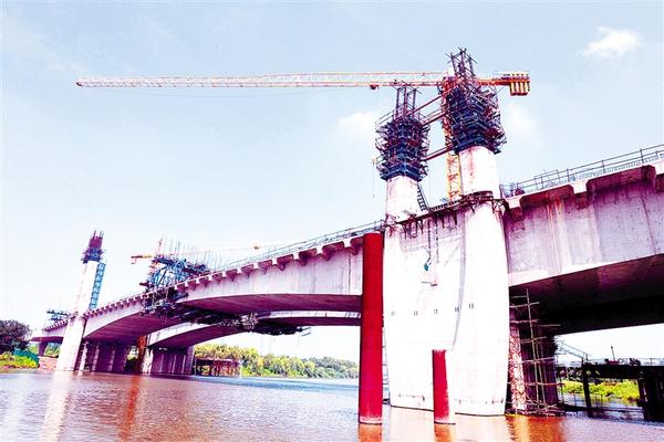 近日,七一路跨沙颍河大桥主跨桥合龙。七一路跨沙颍河大桥开工于2019年11月份,全长为985米,主桥长309米,桥宽45米,主桥结构为变截面预应力混凝土箱梁,采用悬索桥组合结构,其中主跨桥长145米,两个边跨桥是88米,是周口主跨桥洞跨径最大的大桥,建设环境特殊、施工难度大、技术要求高。②16记者 梁照曾 摄