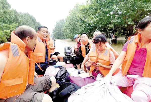 一方有难,八方支援。8月1日21时许,沈丘县神鹰救援队的21名队员携两艘橡皮艇、两台40马力发动机连夜驱车赶往涿州。由于是夜间行车,路上又遭遇拥堵,经过10多个小时的长途跋涉,沈丘县神鹰救援队队员于8月2日9时抵达涿州。他们顾不上休息,立即加入救援工作。