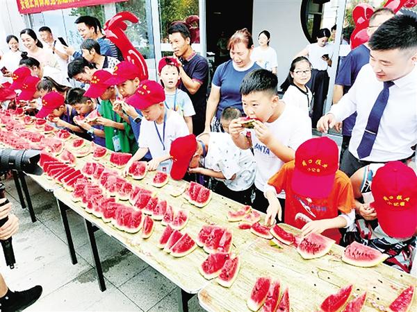 来到售楼部门前,小记者代表安钢正商御湖宽境,向示范区部分环卫工送上西瓜和小食品,表达对环卫工的尊重与慰问。接下来的吃西瓜比赛趣味横生,小记者吃相百态,狼吞虎咽,分秒必争,甜蜜的汁液流出嘴角,刚才的劳累随风而去。