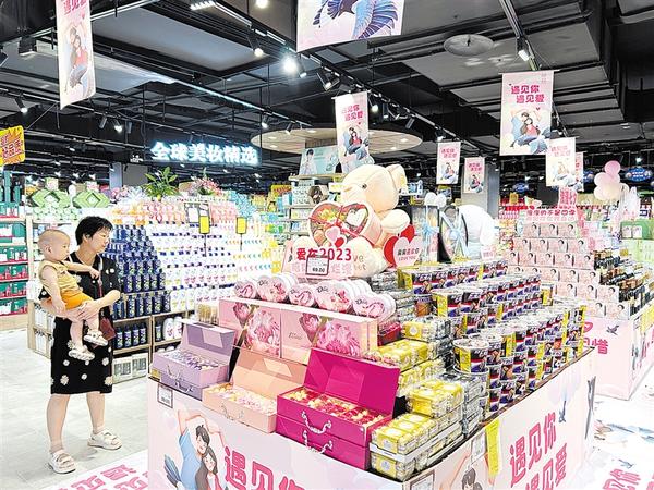 市民在中心城区中原路一家商超的七夕商品专区前浏览。七夕节前夕,许多商超适时推出“甜蜜专柜”,售卖巧克力、毛绒玩具等商品,满足市民的需求。 记者 邱一帆 摄
