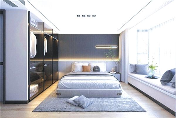 主卧墙面大面积涂刷暖色乳胶漆,在无主灯的基础上增加悬浮灯带,使整个房间充满温馨的感觉。主卧的大飘窗不仅起到了休闲的作用,还有利于室内采光通风。