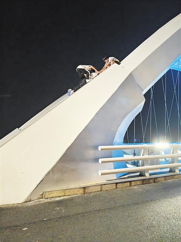 近日,记者路过中心城区沙颍河中原路大桥时看到,3名少年爬上该桥桥拱玩起“滑梯”,桥面上不仅车流量大而且速度快,十分危险。记者 黄佳 摄