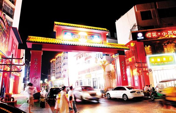 夜幕下的关帝老街,仿古建筑矗立在石板路两侧,大排档绚烂的灯光点缀着街道,这里的人气越来越旺。