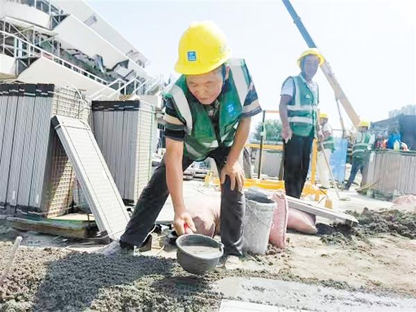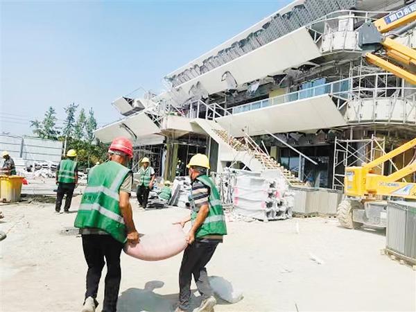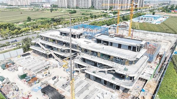 当日上午,记者走进位于市城乡一体化示范区恒山路与东六路交叉口附近的东新区便民服务中心建设现场,看到施工人员佩戴安全帽在紧张作业,四层主体结构已经封顶,外部幕墙正在铺设。楼体外部施工有条不紊,内部装饰也在有序推进,二次结构砌筑已完成,一层卫生间找平层施工已结束,不少工人正在进行内部墙砖、楼梯踏步砖铺贴以及屋顶批白作业。“目前,主楼外墙铝板造型龙骨焊接安装正在进行中,接下来我们将采用交叉作业等方式统筹推进项目建设进度,保质保量按照时间节点完成建设任务。”该项目承建方现场安全生产负责人姚富领说。