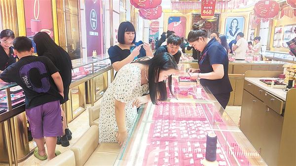 8月31日,记者在文昌万达广场、七一路爱尚家庭茂商场走访黄金品牌店时注意到,尽管近期黄金价格持续上涨,每克达到480元左右,加上工费,达到每克500多元,仍有不少年轻人选购,有将要结婚的情侣,也有结伴购买小克重首饰的闺蜜团。相比热闹的金店,主卖钻戒的店铺生意明显冷清。
