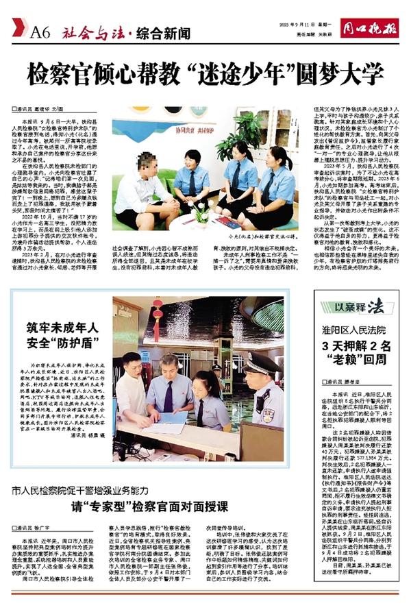 本报讯 9月6日一大早,扶沟县人民检察院“女检察官特别护未队”的检察官接到电话,得知小光(化名)通过今年高考,被郑州一所高等院校录取了。小光在电话里说,开学前,他想和承办自己案件的检察官分享这份来之不易的喜悦。