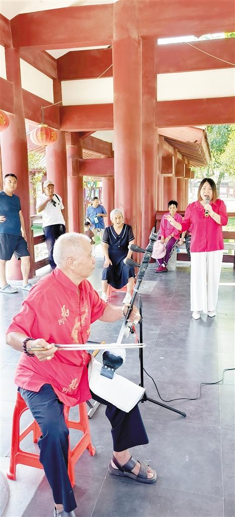 9月16日,几位老年戏曲爱好者在淮阳区苏子读书园凉亭里共同交流戏曲技艺。淮阳区厚重的人文、良好的生态、宜居的环境,使得这里的居民体质逐步增强。多年前,淮阳被授予“中国长寿之乡”荣誉称号。记者 刘俊涛 摄