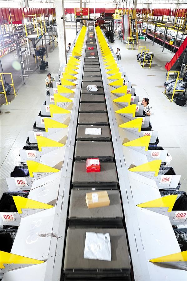 昨日,中心城区顺丰中转站智能化分拣中心,工人正在监测物流自动分拣情况。随着人们生活逐渐走进了信息化时代,物流快递智能化的处理,让更多人可以随时跟踪查询自己网购商品的物流信息。记者 刘俊涛 摄