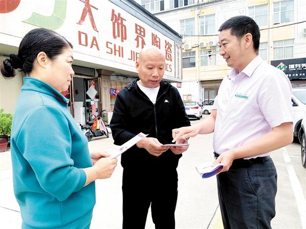 9月26日,农行周口火车站支行工作人员在中心城区向市民发放宣传单,讲解国债知识。