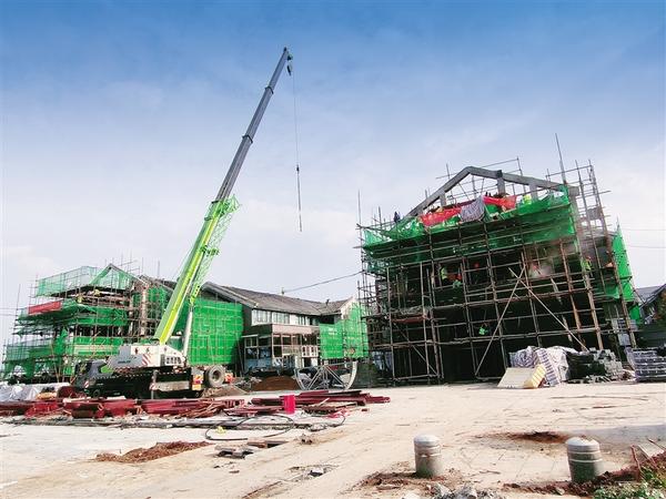 近日,周口市关帝庙历史街区城市更新改造工程现场,工人在紧张施工。该工程规划有照壁、关帝戏台、关帝庙广场等10个项目,通过场所再造和服务升级,传承历史文脉,激发城市活力。记者 沈湛 摄
