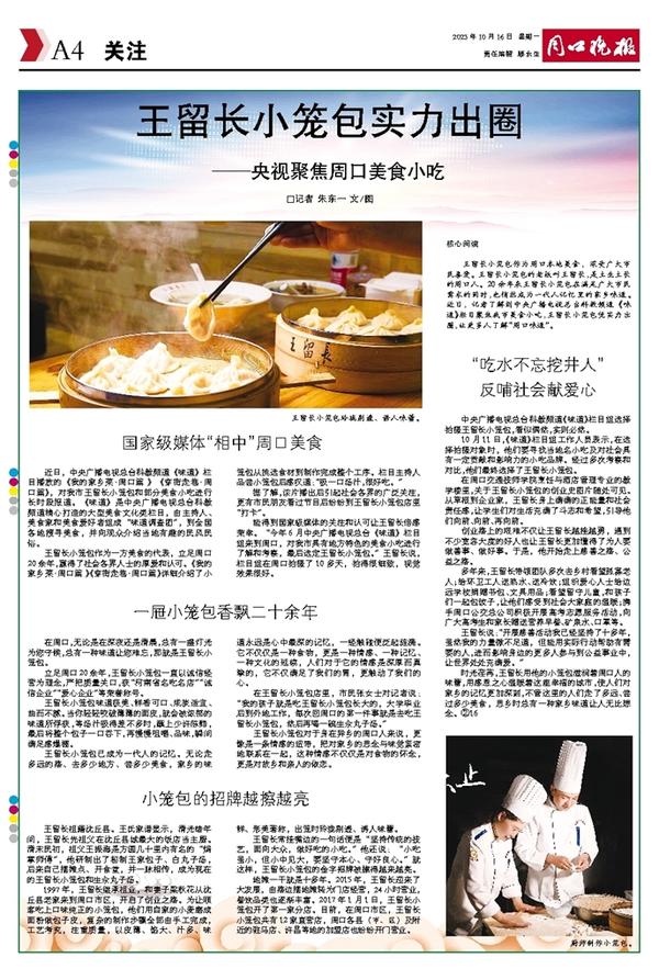 能得到国家级媒体的关注和认可让王留长倍感荣幸。“今年6月中央广播电视总台《味道》栏目组来到周口,对我市具有地方特色的美食小吃进行了解和考察,最后选定王留长小笼包。”王留长说,栏目组在周口拍摄了10多天,拍得很细致,视觉效果很好。