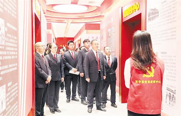 近日,西华县人民检察院组织全体干警在县委党员教育中心开展“党员夜校”集中学习活动。图为干警听讲解员讲述西华英模人物事迹。