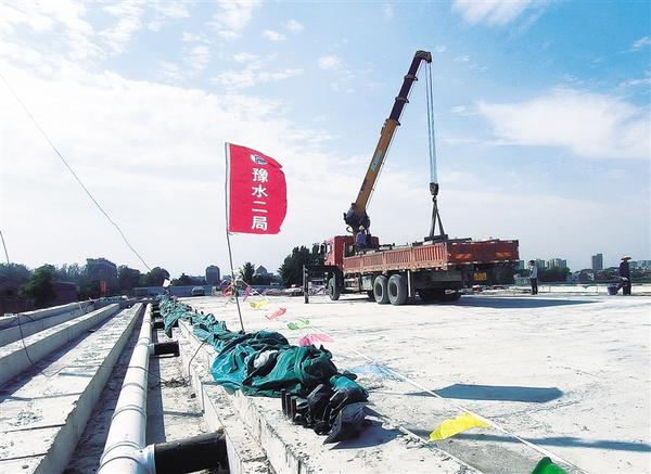 10月18日,在中心城区文昌大道西延工程跨贾鲁河桥施工现场,工人们正在进行桥台、盖梁施工。据了解,该桥是文昌大道西延工程的重要项目,桥梁设计上部采用跨径装配式预应力混凝土先简支后连续箱梁结构,下部采用排架式桩柱结构,长156米、宽30米。该桥建成通车后,将有效缓解建设大道桥的通行压力,方便市民出行。记者 沈湛 摄