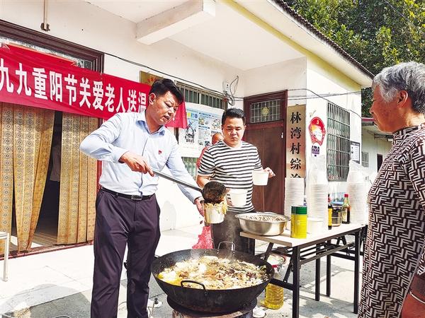 10月18日中午,扶沟县吕潭乡林湾村村委大院里,驻村第一书记何楠为该村老人盛菜。重阳节前夕,市林业保护中心驻扶沟县吕潭乡林湾村工作队举行了“九九重阳节 关爱老人送温暖”活动,邀请全村70余位老人共吃团圆饭,让他们感受到浓浓的关爱。记者 金月全 摄