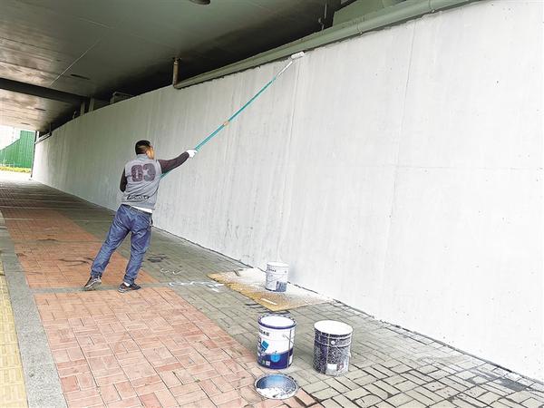 10月19日上午,在中心城区中原路大桥下,工作人员认真粉刷墙面。当日,我市有关部门对大庆路桥和中原路桥涵洞墙面上张贴的小广告进行了清理,对墙面进行了粉刷,提升了大桥的整体美观度。记者 臧秋花 摄