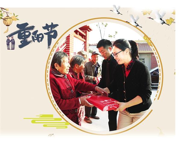 10月20日,河南省人民检察院驻商水县瓦房庄村第一书记宋赟(右一)与村干部一起,为老人们送上爱心大米。为迎接重阳节的到来,该村开展为老人们送爱心大米、陪老人们看电影等暖心活动,营造了孝老爱亲的浓厚氛围。记者 马治卫 摄