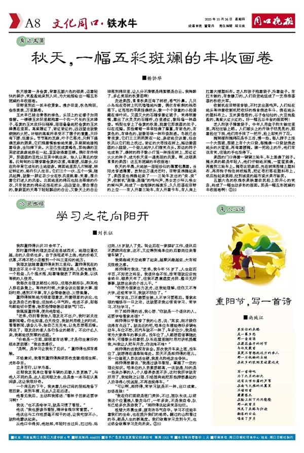 秋天披着一身金黄,背着五颜六色的硕果,迈着轻快的脚步,笑盈盈地来到人间,为大地描绘出一幅五彩斑斓的丰收画卷。