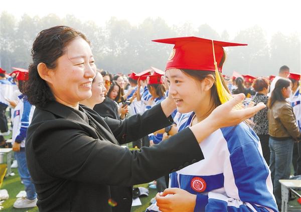 10月28日,鹿邑县高级中学教师和学生家长为学生佩戴成人帽。当天,鹿邑县高级中学在学校田径场举行高三学生成人礼。该校全体高三师生、学生家长参加本次活动。记者 侯国防 通讯员 苏献智 摄