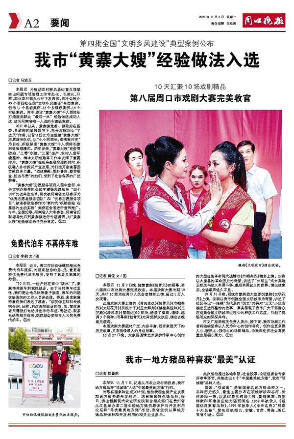 本报讯 为推动农村移风易俗重点领域突出问题专项治理工作常态化、长效化,日前,农业农村部办公厅下发通知,向社会推介49个第四批全国“文明乡风建设”典型案例,包括17个县级案例、18个乡镇级案例、14个村级案例。其中,商水“黄寨大嫂”千人胡同长打通服务群众“最后一米”经验做法成功入选,成为河南省唯一入选的乡镇级案例。