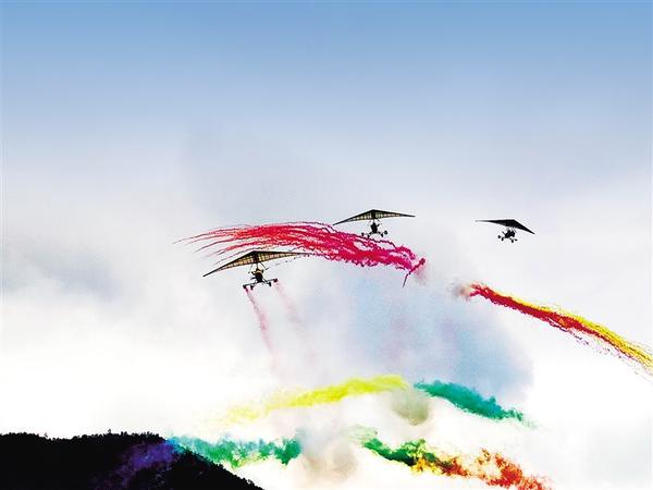 11月10日上午,在美丽的浙江千岛湖畔举行的“2023建德飞行大会”会场上空,3架动力三角翼滑翔机进入观众视线。它们边变换阵形,边喷出彩色烟雾,在天空中画出一道道绚丽的线条,吸引了不少观众。据悉,这个飞行团队共有4人,其中3人是退伍军人,鹿邑籍退伍军人梁洪豪便是这个团队的发起人。