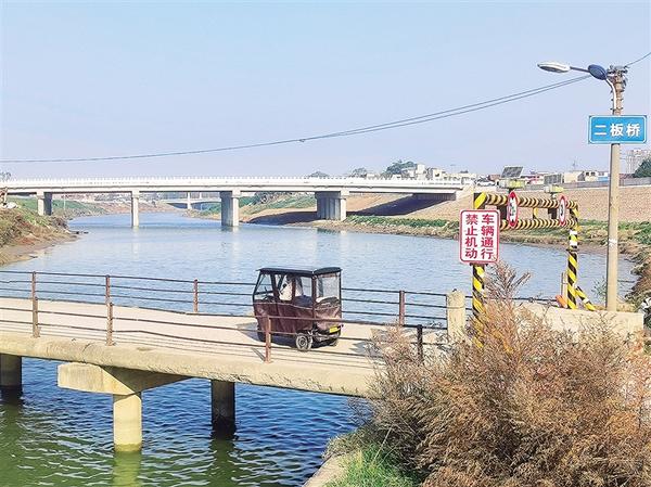 11月14日,一辆电动三轮车行驶在二板桥上。随着新桥的即将竣工,年久失修的二板桥已经悬挂起“禁止机动车通行”的警示牌,不久后将正式“退休”。