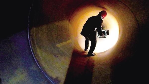 10时许,记者一行猫着身子钻进直径只有1.4米的供暖主管网,从入口处望去,漆黑的管道深处有一个亮点,那里便是河北岸的管道出口处。借助补光灯,记者小步向前走了十几米,管道内的温度略比外面高了一些,而且格外寂静,静得能听到呼吸声。“我现在又紧张又兴奋又害怕,想赶快走出去,在这里有一种幽闭恐惧的感觉。”同行记者李龙周说。