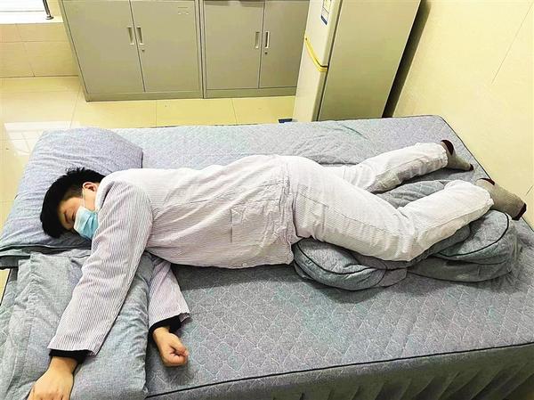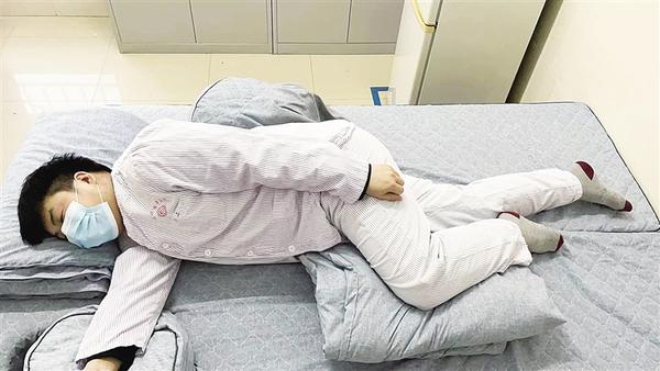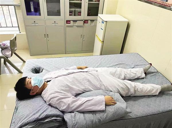 (6)健侧下肢保持踏步姿势,放枕头上,膝关节和踝关节略屈。