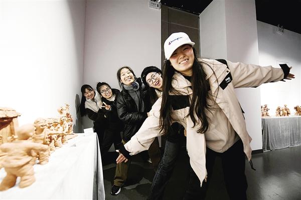 12月8日上午,观看作品展的女孩子们开心地模仿泥塑作品拍照。当日上午,由市文联和郸城县委宣传部主办,郸城县文联、市民间文艺家协会、市美术馆承办的张振福张玉萍乡土丹钧泥塑作品展在市美术馆开展,共展出120多件泥塑和钧瓷作品。该展是我市工艺美术大师张振福和女儿张玉萍近年来创作成果的一次集中展示,也是2023年度周口市文艺精品创作工程重点项目之一。 记者 梁照曾 摄