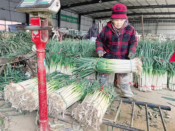 12月11日,中心城区黄淮农产品大市场的一名商户正在忙着称重、发货。据介绍,今年本地大葱喜获丰收,价格一路走低,预计冬至前后将迎来销售高潮。记者 邱一帆 摄