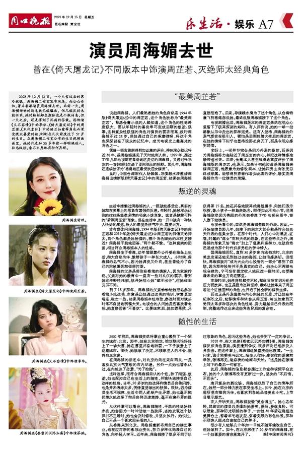 2023年12月12日,一个大雪过后的寒冷夜晚,周海媚工作室发布消息,向公众告知,著名香港演员周海媚去世。此前一天,周海媚辞世的消息就已经爆出,但几经反转未能证实,她的粉丝都在期盼这是个假消息,但一天之后,还是得到了沉痛的答案。因饰演《义不容情》中的李华、《倚天屠龙记》中的周芷若、《末代皇孙》中的纳兰如意等角色而深受观众喜爱的她,刚刚在几天前度过了57岁的生日。在周海媚工作室公布的生日视频画面里,她的外表和30多年前一样明艳动人,状态极佳,看不出身体有任何异样。