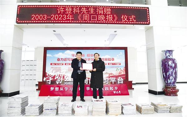 当了20年的忠实粉丝后,12月15日,许登科来到周口日报社,把收藏了20年的《周口晚报》全部捐赠。“今天我把收藏的报纸捐赠给报社,它们不是平常的‘回家’,而是完成了传递信息的光荣使命后,带着读者的满意‘荣归’。”许登科说。