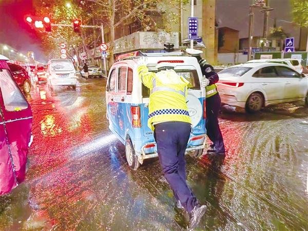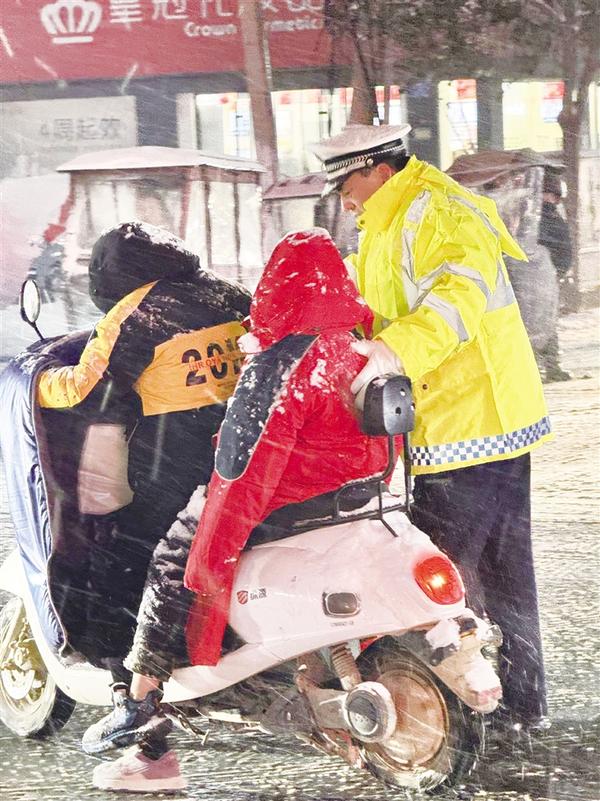 路面积雪结冰,车辆通行受阻,给出行的车辆和行人带来了诸多不便。周口交警坚守岗位,一抹抹“荧光绿”在寒风中疏导交通。在执勤的同时,民辅警配合相关部门拿铁铲除冰,保障道路畅通。遇见“趴窝”打滑车辆,民警秒变“推车工”,及时救助被困车辆。他们战冰雪、保畅通、护民安,成为雪中的一抹靓丽“警”色,用实际行动为城市注入了一股暖流。③5