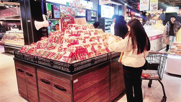 12月18日,市民在中心城区一超市内选购草莓。因草莓种植户增加等原因,今年我市草莓价格较去年出现大幅下降。记者走访发现,目前中心城区市场上销售的草莓价格在15元~20元每斤,与去年同期每斤30元左右的价格相比,价格近乎“腰斩”。③2记者 郭董航 田亚楠 摄