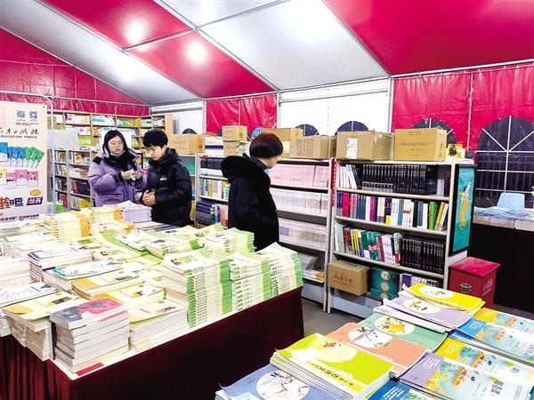 2023年12月30日晚,天气寒冷,周口市新华书店展销厅内多名读者在挑选读本。由于新华书店近期装修门店,临时在五一文化广场搭建了展销厅,虽然没有取暖设备,但并没有挡住读者前来购书的热情。 记者 沈湛 摄