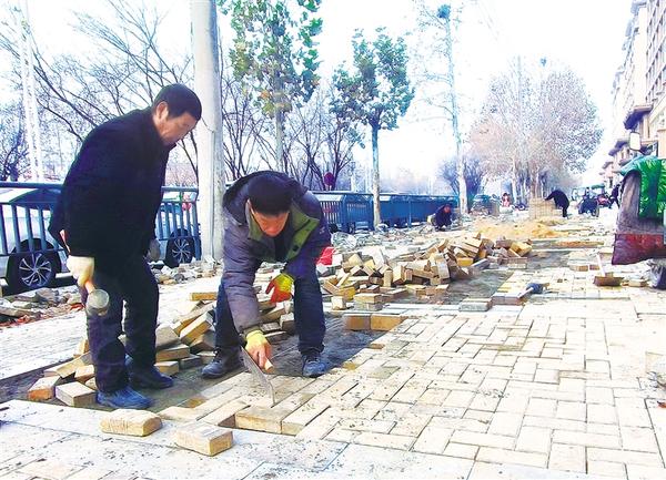 1月2日,工人在中心城区庆丰路铺设人行道地砖。为尽快恢复城区道路畅通、保障市民出行,供暖工程后期完善施工如火如荼进行中。 记者 沈湛 摄
