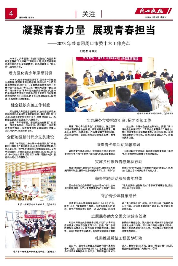 2023年,共青团周口市委引领全市广大团员青年紧紧围绕“十大战略”三年行动计划,认真贯彻落实市委五届四次全会部署要求,在各领域争当“排头兵”,成为生力军。