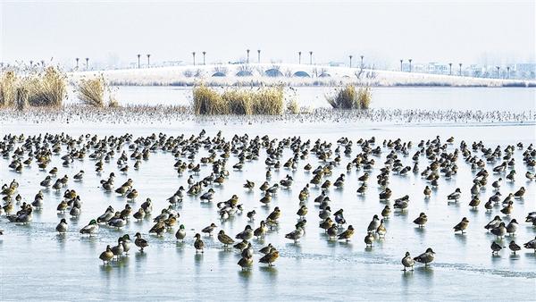 近日,一群野鸭飞抵淮阳龙湖国家湿地公园,有细心的市民数了一下,大约有1000多只。由于龙湖生态环境越来越好,每年都有大批的野生水鸟到此栖息。 记者 杜欣 摄