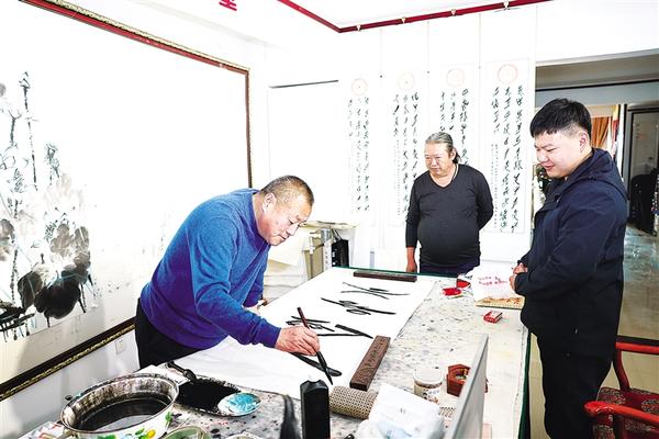1月5日,闫振宇(左一)在创作女书作品。当天,郸城县中州文化艺术传媒公司创办人闫振宇、李玉兰夫妇收到了由周口市文化广电和旅游局颁发的周口市非物质文化遗产代表项目证书,闫振宇的“郸城女书”、李玉兰的“唐桥鸭蛋制作技艺”双双入选周口市非物质文化遗产代表项目。 记者 徐松 摄