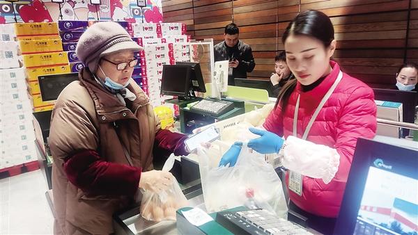 昨日,中心城区某超市收银员使用可降解环保购物袋为顾客打包商品。2024年1月1日,《河南省禁止和限制不可降解一次性塑料制品规定》正式施行。记者近日走访发现,中心城区众多连锁超市均已使用可降解环保购物袋,每个袋子价格在0.3元左右,顾客可以根据需求选择购买。 记者 田亚楠 摄