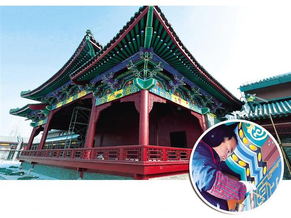 1月12日上午,在关帝庙历史街区,工人正为关帝庙大戏台的回廊做彩绘,以迎接月底开街唱大戏。据了解,经过紧张施工,关帝庙大戏台主楼的彩绘工作已经完成,回廊的彩绘工作将于近期完成。 记者 梁照曾 摄