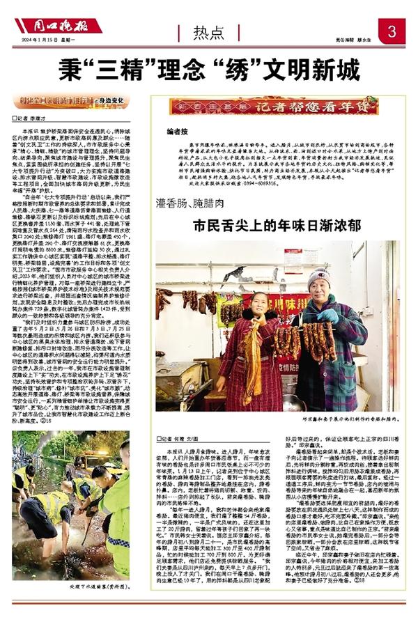 “每年一进入腊月,我和老伴都会来他家灌香肠。最近猪肉便宜,我们灌了整整54斤香肠,一半是微辣的,一半是广式风味的,还在这里加工了20斤腊肉,留着过年等孩子们回家了再一块吃。”市民韩女士笑着说。据店主邱宗鑫介绍,每年的腊月初八到腊月二十一,是市民灌香肠的高峰期,店里平均每天能加工300斤至400斤腊制品,忙的时候能加工700斤到800斤。为更好满足顾客需求,他们店还免费提供晾晒服务。“我们夫妻是从四川泸州来的,每天早上7点多开门,晚上没人了才关门。我们在周口干灌香肠、腌腊肉生意已经10年了,用的拌料都是从四川老家配好后带过来的,保证让顾客吃上正宗的四川香肠。”邱宗鑫说。