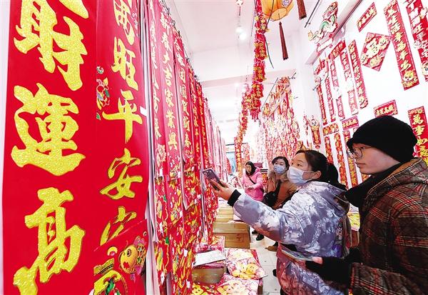 1月17日上午,人们正在挑选春联。当日,记者在中心城区华耀城的几家春联、花灯用品店看到,各地群众纷至沓来,购买春联、花灯等过节用品。记者看到,市场内围绕龙文化的春联和花灯品种全、花样多,深受消费者欢迎。③2记者 梁照曾 摄